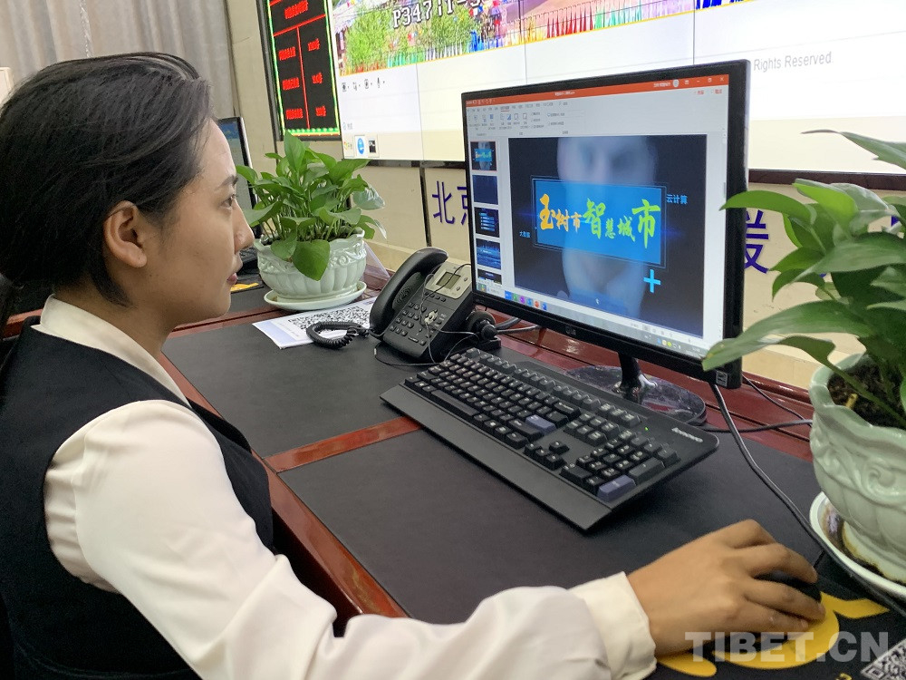 圖為工作人員向記者展示玉樹“智慧城市”有關(guān)內(nèi)容