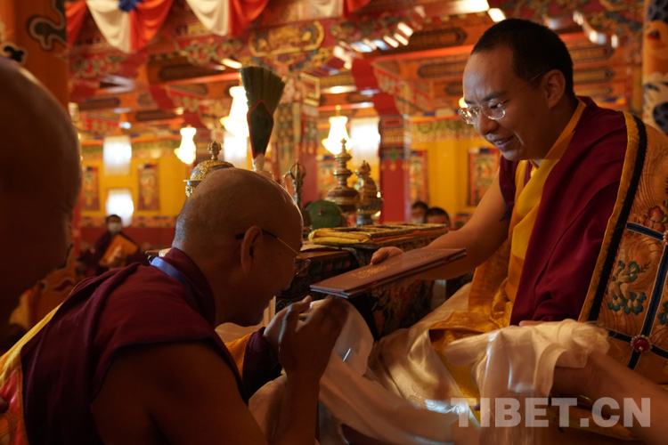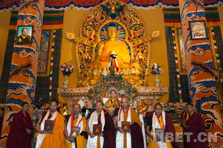 圖為十一世班禪為高僧頒發(fā)然講巴學位證書 攝影:鄭朔