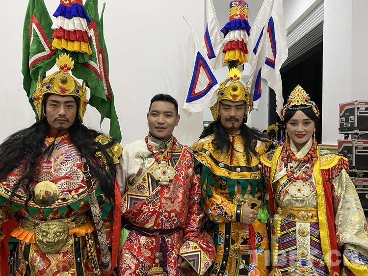 圖為斯塔多吉(左二)準(zhǔn)備表演格薩爾史詩(shī)片段