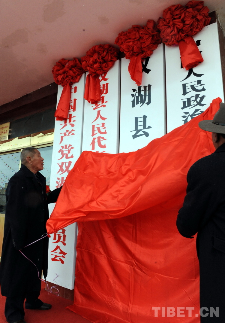 這是洛桑丹珍(左)在為雙湖設(shè)縣掛牌(唐召明2013年7月26日攝)