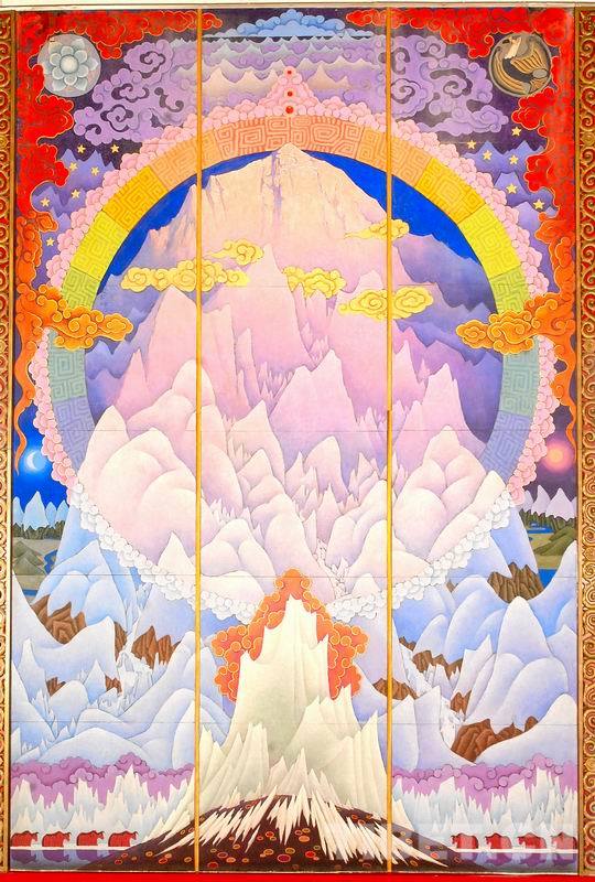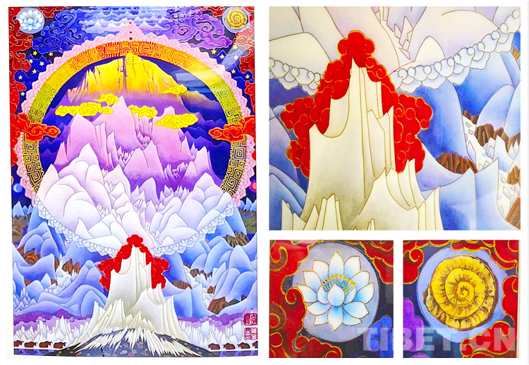 而令葉星生深受觸動(dòng)的,是十世班禪大師對(duì)創(chuàng)作的關(guān)心、前衛(wèi)的創(chuàng)作思路和嚴(yán)格的要求。“十世班禪大師多次提出指導(dǎo)意見(jiàn),鼓勵(lì)我們大膽創(chuàng)新,要融入光影等繪畫(huà)新技法及漢族傳統(tǒng)繪畫(huà)技法,使珠峰更有立體感,使畫(huà)作成為現(xiàn)代藝術(shù)技法與藏族傳統(tǒng)繪畫(huà)手法相融合的代表,成為民族團(tuán)結(jié)的象征。所以,這幅畫(huà)在結(jié)構(gòu)上參考了唐卡,比如彩虹;祥云、太陽(yáng)、月亮、星斗對(duì)稱(chēng)的方式等來(lái)自西藏傳統(tǒng)壁畫(huà)藝術(shù);但在光線(xiàn)、明暗對(duì)比等方面加入了漢地工筆重彩,甚至西方的藝術(shù)手法。在天地之間以更加立體的視角展現(xiàn)出了珠峰壯麗雄偉的全景?!?/p>