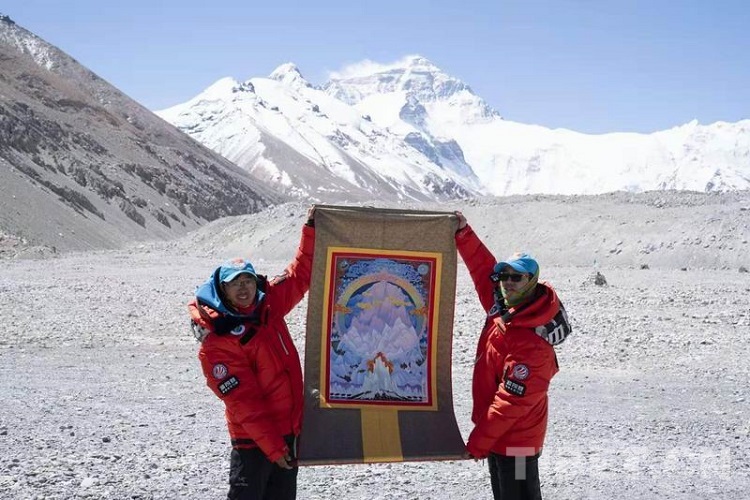 圖為2020年5月中國(guó)珠峰高程測(cè)量登山隊(duì)手持《珠峰疊彩》新唐卡在珠峰腳下合影
