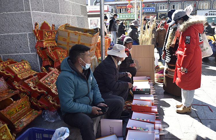 “阿佳,‘孜卓’要嗎?自己做的。”2月9日,記者在八廓商城走訪年貨市場(chǎng)時(shí),遇上了來自日喀則市仁布縣普松鄉(xiāng)的頓旦和他的同伴們。四個(gè)人在八廓商城外的巷子邊擺了十多對(duì)酥油花,招攬生意。遇上過往人群多瞧一眼,他們總是耐心地揭開盛放酥油花的鞋盒蓋,期待著多賣出一對(duì)酥油花。