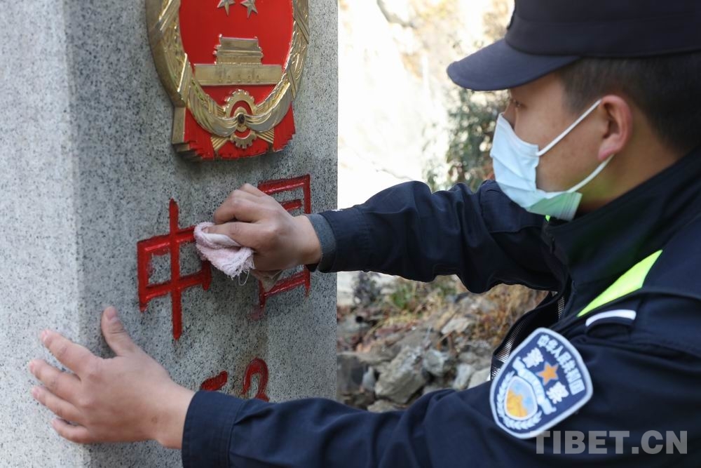 圖為執(zhí)勤點(diǎn)民警為神圣的界碑描紅 攝影:鄒興國(guó)
