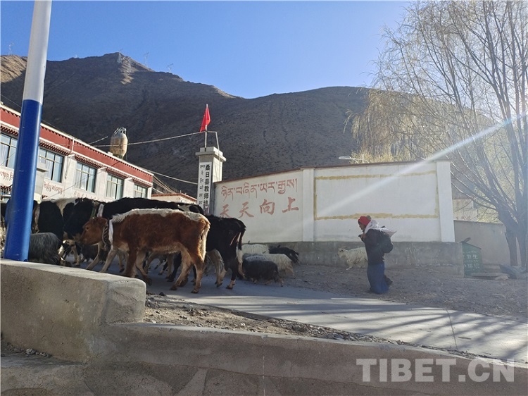 圖為一大早就趕著牛羊去放牧的次仁玉珍