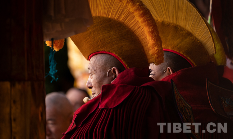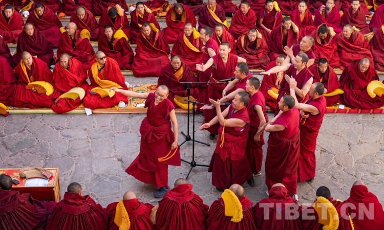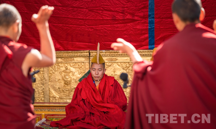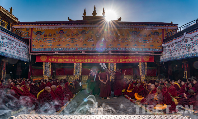 圖為西藏自治區(qū)2021年度藏傳佛教學(xué)經(jīng)僧人考核晉升格西拉讓巴學(xué)位立宗答辯暨頒證儀式現(xiàn)場(chǎng) 攝影:趙耀