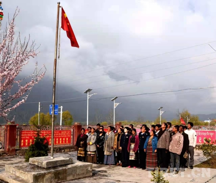 圖為稅收干部和當(dāng)?shù)厝罕娫谖鞑刈灾螀^(qū)日喀則市吉隆鎮(zhèn)達(dá)曼村開展升國旗儀式