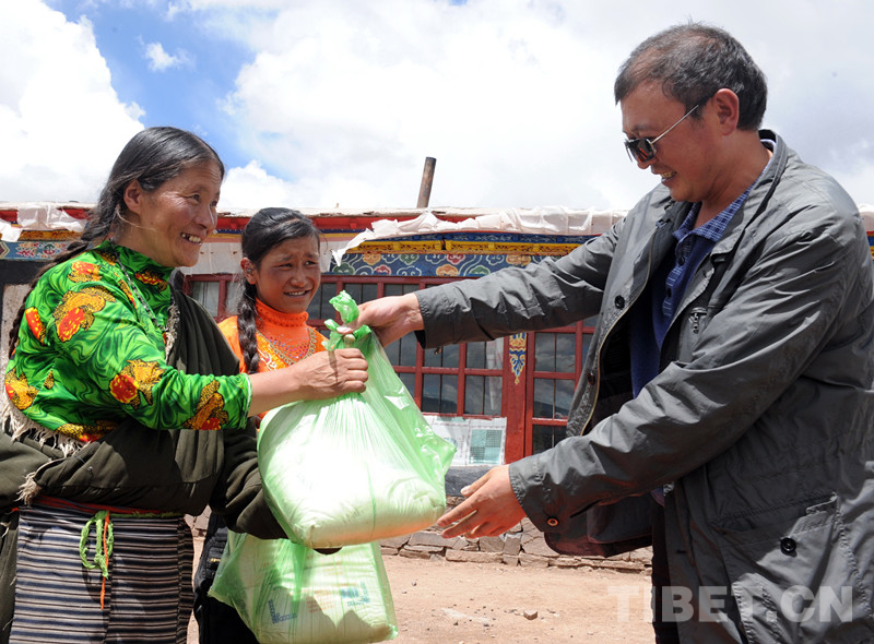 這是時(shí)任班戈縣副縣長的李正斌看望曾罹患巨大腫瘤的牧女斯求卓瑪,為她送去糧油等慰問品(唐召明2012年8月3日攝)