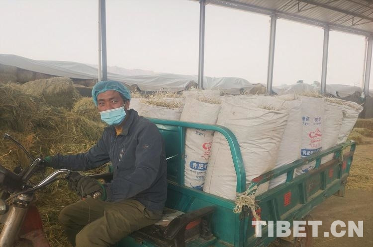 圖為崗尖村村民普布在養(yǎng)殖場運(yùn)送草料 圖片由受訪者提供