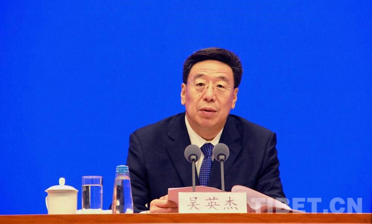 圖為中共西藏自治區(qū)委員會(huì)書(shū)記吳英杰在發(fā)布會(huì)上介紹西藏發(fā)展情況 攝影:劉莉