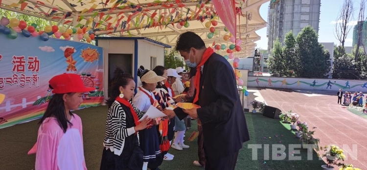 圖為西藏自治區(qū)拉薩市城關(guān)區(qū)納金小學(xué)“童心向黨、做時(shí)代新人”六一兒童節(jié)活動(dòng)現(xiàn)場為優(yōu)秀學(xué)生頒獎(jiǎng)