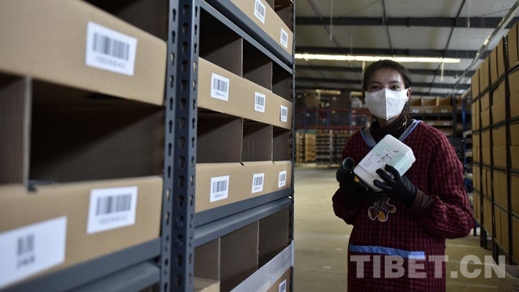 圖為西藏自治區(qū)級公共物流倉儲配送中心里,作業(yè)人員將搬運(yùn)型機(jī)器人“地狼”載來的貨架上的貨物取出