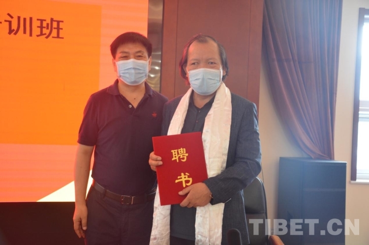 圖為仲格嘉向明珠同志頒發(fā)聘書,聘請明珠為北京藏醫(yī)院藏藥浴專題培訓班授課老師