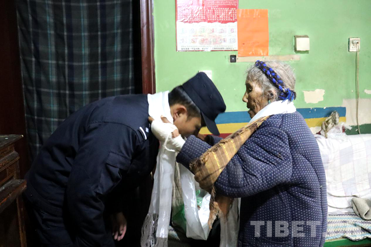 圖為格桑卓嘎老奶奶向洛桑旦增獻(xiàn)哈達(dá)