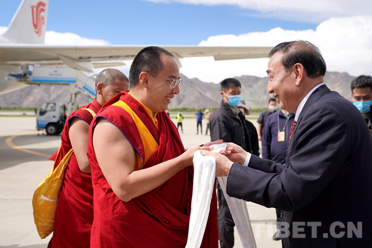 西藏自治區(qū)黨委常委、統(tǒng)戰(zhàn)部部長,區(qū)政協黨組副書記、副主席旦科等西藏自治區(qū)相關領導在貢嘎機場迎接,互敬哈達。