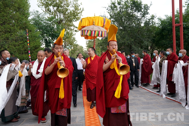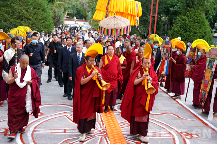 在雪林多吉頗章主殿門前,僧眾提前繪制了金剛結等吉祥圖案,尺許寬的地毯從歡迎隊伍處一直延伸到主殿門前。法號響起,高僧們手持香爐,打著幡幛、華蓋,吹奏佛樂,以藏傳佛教隆重的禮儀迎接班禪的到來。在眾高僧的簇擁下,班禪向夾道歡迎的僧俗信教群眾頷首微笑、揮手致意。在僧俗信教群眾目光的緊緊追隨中,班禪緩步進入雪林多吉頗章主殿。(中國西藏網 記者/王淑 旦增拉姆 歐帆)