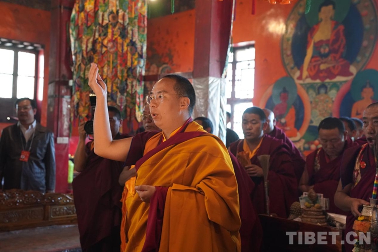 在每所寺院開展佛事活動時,班禪按宗教儀軌向僧眾發(fā)放布施、供齋茶、齋飯,同時關(guān)切詢問僧人的學經(jīng)、修行、生活等情況。班禪在講經(jīng)、闡釋教義的同時,多次勉勵僧眾要適應人民群眾向往追求的方向,講好經(jīng),傳好法,做合格僧尼。言傳身教、以身作則,引導寺廟僧尼和信教群眾正信正行。