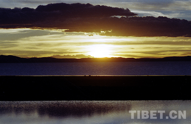 這是晚霞中的納木錯(cuò)景觀(唐召明1987年攝)