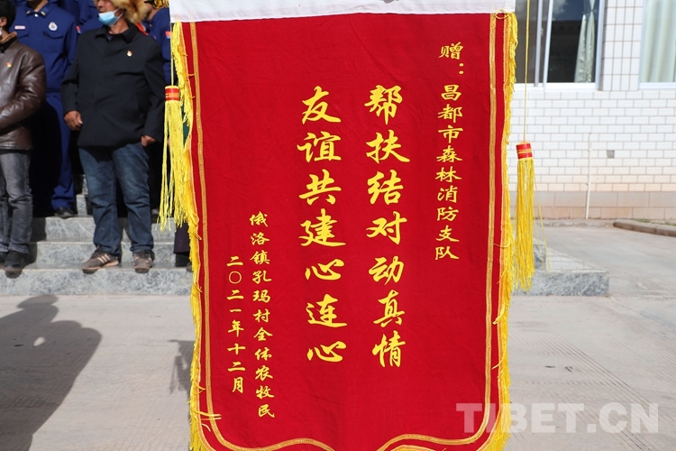 圖為孔瑪村向昌都市森林消防支隊獻上錦旗