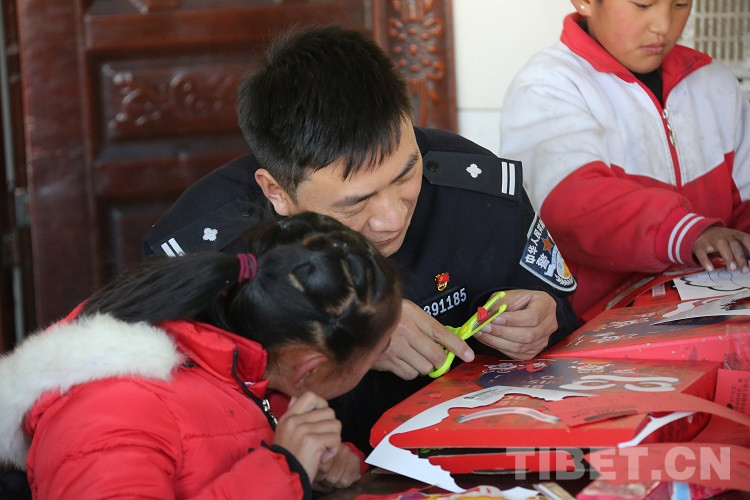 圖為拉薩邊檢站民警和孩子們共同完成手工剪紙 攝影:王佳豪