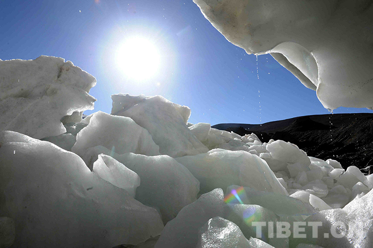 此外,被稱為除南極、北極以外的世界第三大冰川——普若崗日冰川的融水痕跡也很明顯,冰原外圍冰體常見掛滿融水的冰凌;常見正在融化、殘留地面的許多冰塊及那些從冰川下裸露出的大大小小的石頭。