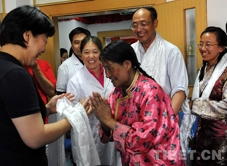 這是術后的斯求卓瑪在北京藏醫(yī)院向幫助她治病的北京安貞醫(yī)院“海歸”醫(yī)生顧虹(左一)和新華社記者唐召明(右二)等人敬獻哈達,表示感謝(王普2010年5月20日攝)