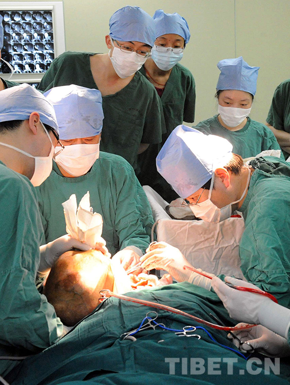 這是北京口腔醫(yī)院口腔頜面外科醫(yī)生在為牧女斯求卓瑪實施手術,將其脖子上一個重達5公斤的巨大腫瘤成功切除(唐召明2010年4月21日攝)