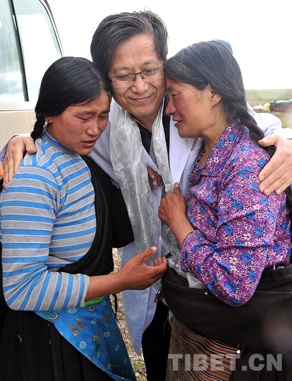 這是曾為斯求卓瑪進行手術的北京口腔醫(yī)院口腔頜面外科主任韓正學來到西藏自治區(qū)那曲市班戈縣新吉鄉(xiāng),在為斯求卓瑪作術后檢查時,卓瑪母女倆奔向韓正學懷抱相擁而泣(唐召明2015年7月14日攝)