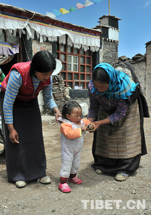 這是斯求卓瑪(右)與女兒嘎瑪旺姆一起,幫助外孫女學走路(唐召明2015年7月15日攝)
