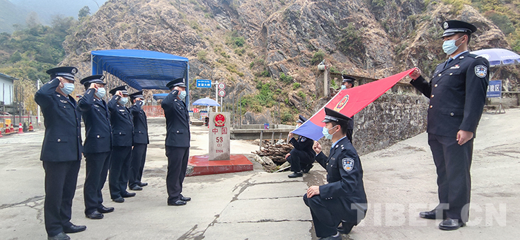 圖為友誼橋執(zhí)勤點民警歐珠次仁在警察節(jié)來臨之際為界碑描紅