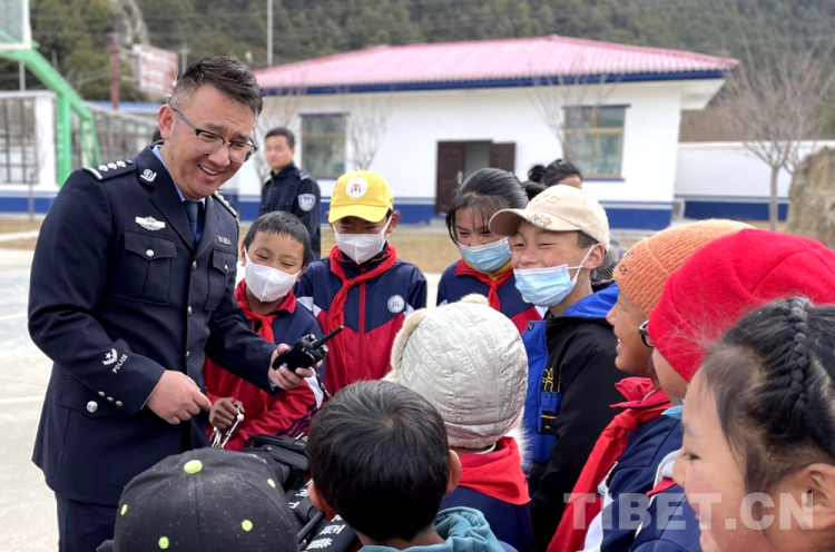 圖為林芝南伊邊境派出所邀請駐地小學(xué)生參觀邊境派出所警用裝備 攝影:馬智慧