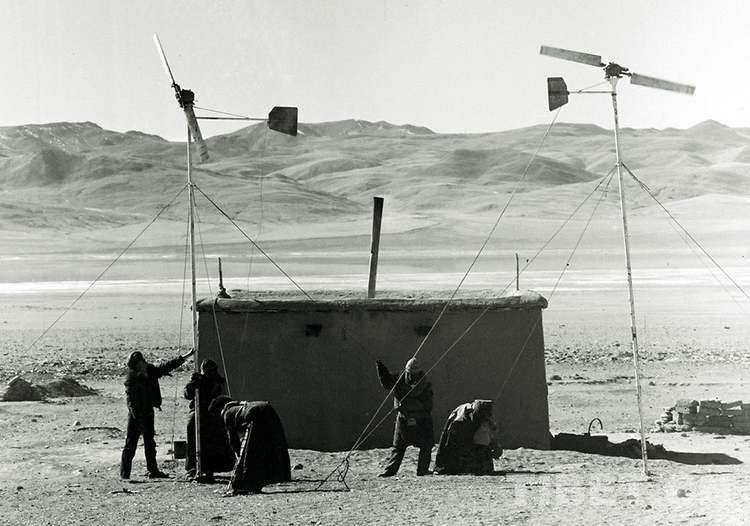 這是那曲地區(qū)風(fēng)能試驗(yàn)站技術(shù)人員在對(duì)那曲地區(qū)雙湖辦事處(現(xiàn)那曲市雙湖縣)嘎措鄉(xiāng)的風(fēng)力發(fā)電機(jī)進(jìn)行檢修保養(yǎng)(唐召明1988年攝)