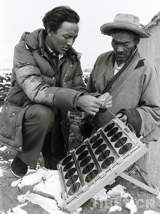 這是那曲地區(qū)風(fēng)能試驗(yàn)站站長(zhǎng)次真在風(fēng)力發(fā)電機(jī)試點(diǎn)鄉(xiāng)的那曲地區(qū)那曲縣(現(xiàn)那曲市色尼區(qū))德吉鄉(xiāng)指導(dǎo)牧民群眾使用太陽能硅光電池板(唐召明1987年攝)