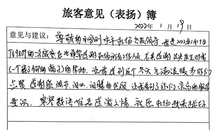 事雖小,但暖人心。數(shù)九寒冬的日喀則,室外冰雪連天,但達(dá)娃央金醫(yī)生這些服務(wù)舉措?yún)s讓張某感受到了春天般的溫暖。他便立即用旅客質(zhì)樸的語言書寫了自己被幫助后的感動(dòng)之情。這也是日喀則航站在2022年收到的第二封感謝信。