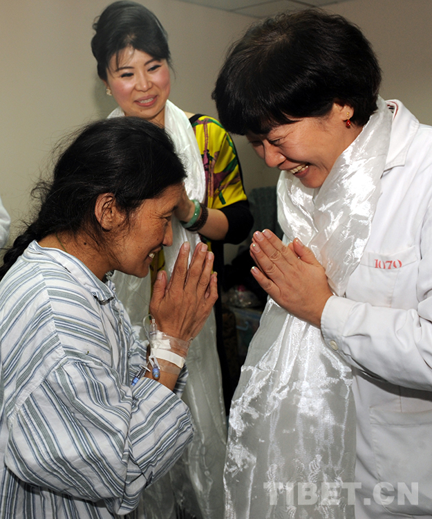 這是術(shù)后準(zhǔn)備出院的藏族婦女才塔爾(前左)在北京安貞醫(yī)院向?yàn)樽约鹤鍪中g(shù)、幫著捐款的醫(yī)生顧虹敬獻(xiàn)哈達(dá),并雙手合十致謝(唐召明2013年4月15日攝)