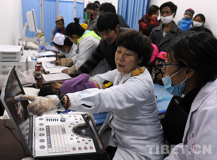 這是北京安貞醫(yī)院醫(yī)生顧虹在班戈縣人民醫(yī)院為當(dāng)?shù)貎和M(jìn)行先天性心臟病篩查(唐召明2015年10月8日攝)