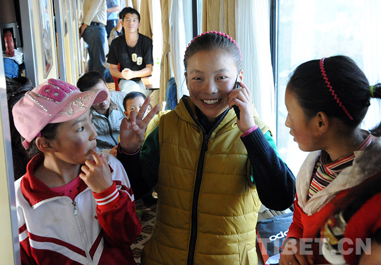 這是乘火車進(jìn)京到北京安貞醫(yī)院進(jìn)行先天性心臟病治療的患兒卓嘎,在火車將抵達(dá)北京時(shí),給阿爸打電話報(bào)平安(唐召明2012年9月18日攝)
