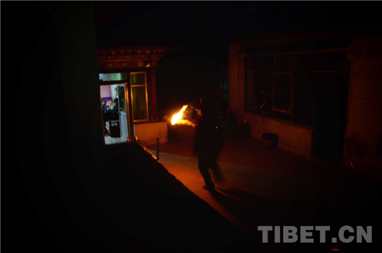 酒足飯飽后,“驅(qū)鬼”儀式開始。家人們一起各自用糌粑從頭到腳觸碰一遍、捏下手印后,與故意吃剩的一點(diǎn)古突扔進(jìn)驅(qū)鬼盤,寓意將身心中的病痛與不詳全部拋掉。隨后查斯點(diǎn)燃火把,一邊喊著“所有妖魔都出去”,一邊手持火把跑往所有屋子各掃幾下,拿著火把和驅(qū)鬼盤到交叉路口焚燒掉。一路狂奔,且不能回頭。