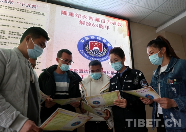 在西藏出入境邊防檢查總站執(zhí)法調(diào)查支隊辦證大廳,辦證室民警結(jié)合辦證室群眾多、人流量大的實際,開展以“攜手法律宣傳,共建平安邊境”為主題的宣傳活動。通過懸掛宣傳標語、設置新舊西藏對比圖片專欄、發(fā)放“新舊西藏對比圖及涉邊法律法規(guī)”為主題的宣傳單等多種渠道,講解西藏百萬農(nóng)奴翻身得解放的歷史背景,讓更多游客群眾了解西藏民主改革以來波瀾壯闊的發(fā)展史和翻天覆地的新變化,銘記只有中國共產(chǎn)黨才能領導西藏各族群眾過上幸福美好的生活。