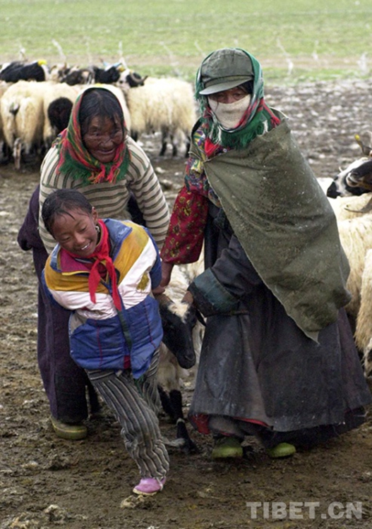 這是嘎措鄉(xiāng)一位小學(xué)生利用業(yè)余時間,在幫助村民拽拉不肯挪步的羊只統(tǒng)一去擠奶。這種勞動到年底也可獲得一定的工分收入(唐召明2001年攝)