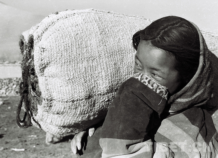 這是一名小學(xué)生利用業(yè)余時間撿拾牛糞,然后肩扛裝好的成袋牛糞去交集體作燃料。這種勞動到年底也可獲得一定的工分收入(唐召明1988年攝)