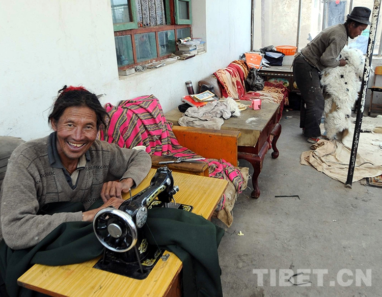 這是嘎措鄉(xiāng)縫紉組牧人在縫制藏裝。他們的專業(yè)化勞動,到年底也是按照工分的高低,按勞取酬(唐召明2009年攝)