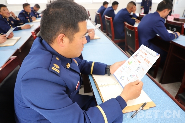 圖為該中隊(duì)隊(duì)員認(rèn)真閱讀防范電信網(wǎng)絡(luò)詐騙宣傳手冊