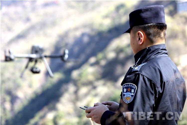 圖為民警利用無人機對波曲河道兩翼滑坡地段進行勘測 攝影:鄒興國