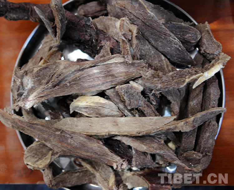 藏北草原的冬天地凍天寒,冬宰后的牛羊肉在房子和帳篷外自然冰凍,這個季節(jié)人們則多吃凍肉。凍肉一般是用溫水泡軟后煮“土巴”吃,個別的時候也有生吃的。風干肉是藏北很特殊的食物。每年冬宰后,各家各戶都要做風干肉,以備來年之需。
