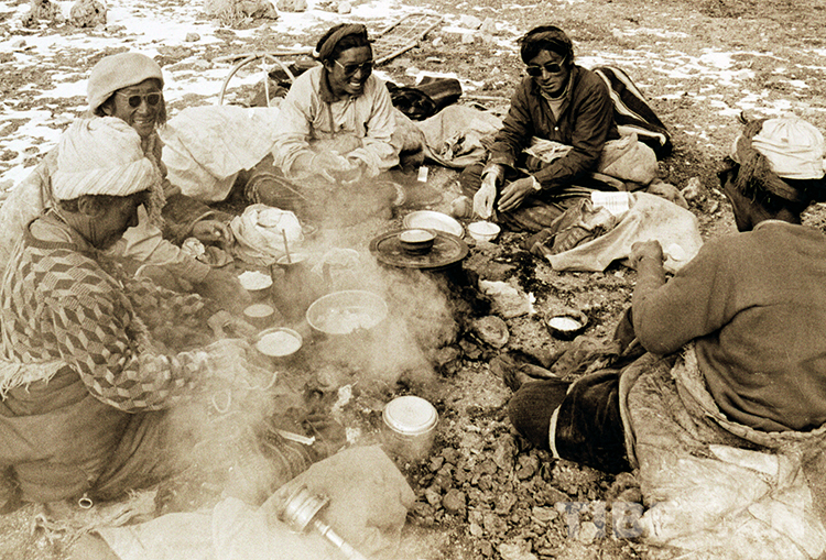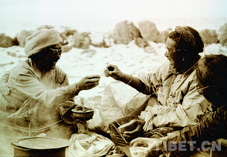 這是在班戈縣納木錯湖邊煮茶、抓糌粑、禮讓糌粑的藏北牧人(唐召明1991年攝)