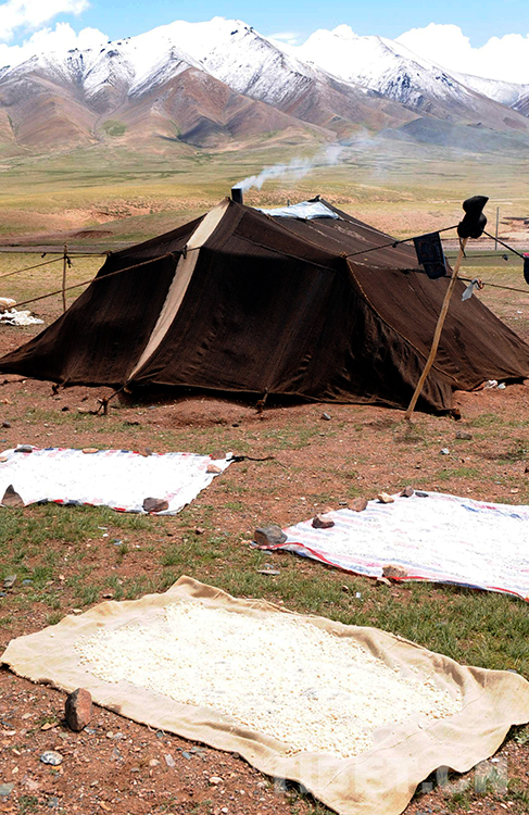 在藏北草原,夏天是牦牛產奶旺季,牧民此時吃奶類食物比別的季節(jié)多。喝的奶大多是牦牛奶,其次為綿羊奶和山羊奶。人們既喝鮮奶,也喝酸奶、吃奶渣。奶渣大多是拌糌粑時食用。