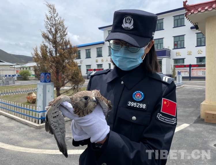 圖為民警與被救助的金雕幼鳥 攝影:旦增多吉