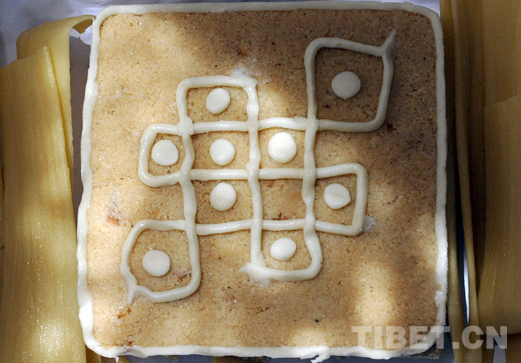 這是使用酥油、奶渣等混合制成的食品“褪”。它類似年糕,酥軟香甜可口(唐召明2013年7月25日攝)