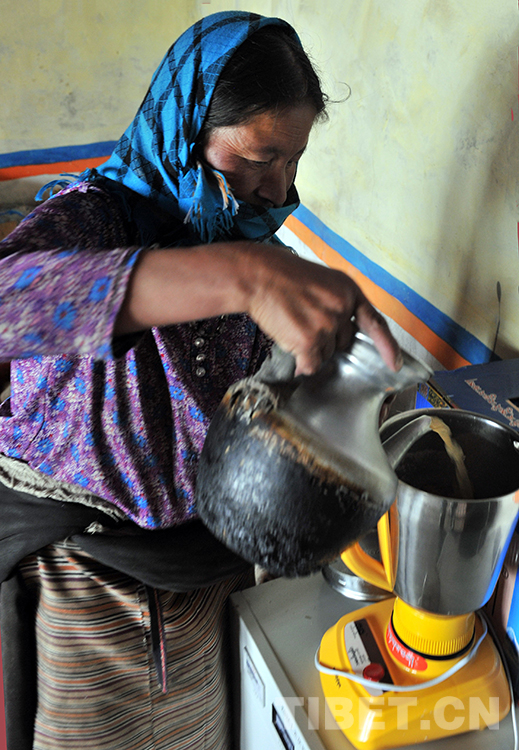 這是班戈縣新吉鄉(xiāng)術(shù)后的斯求卓瑪向放入酥油的電動(dòng)攪拌壺里倒茶水,準(zhǔn)備用電來(lái)打制酥油茶(唐召明2015年7月14日攝)
